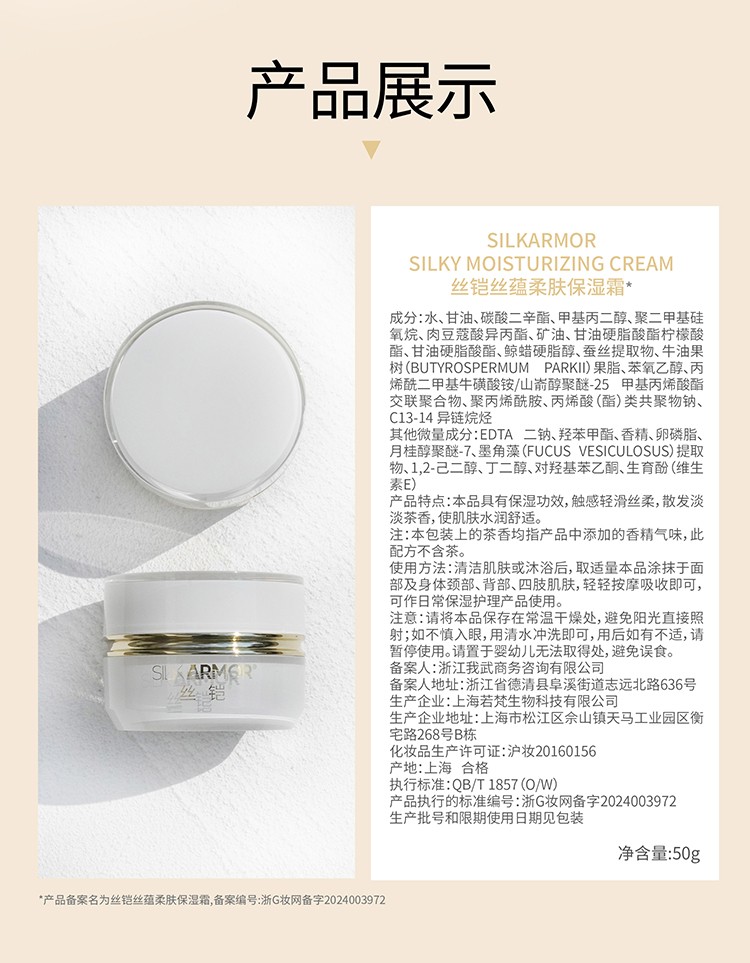 【备案编号】:浙G妆网备字2024003972 【产品特点】:本品具有保湿功效,触感轻滑丝柔,散发淡淡茶香,使肌肤水润舒适。 【使用方法】:清洁肌肤或沐浴后,取适量本品涂抹于面部及身体颈部、背部、四肢肌肤,轻轻按摩吸收即可,可作日常保湿护理产品使用。 【适合人群】:普通人群 【产品有效期】:3年